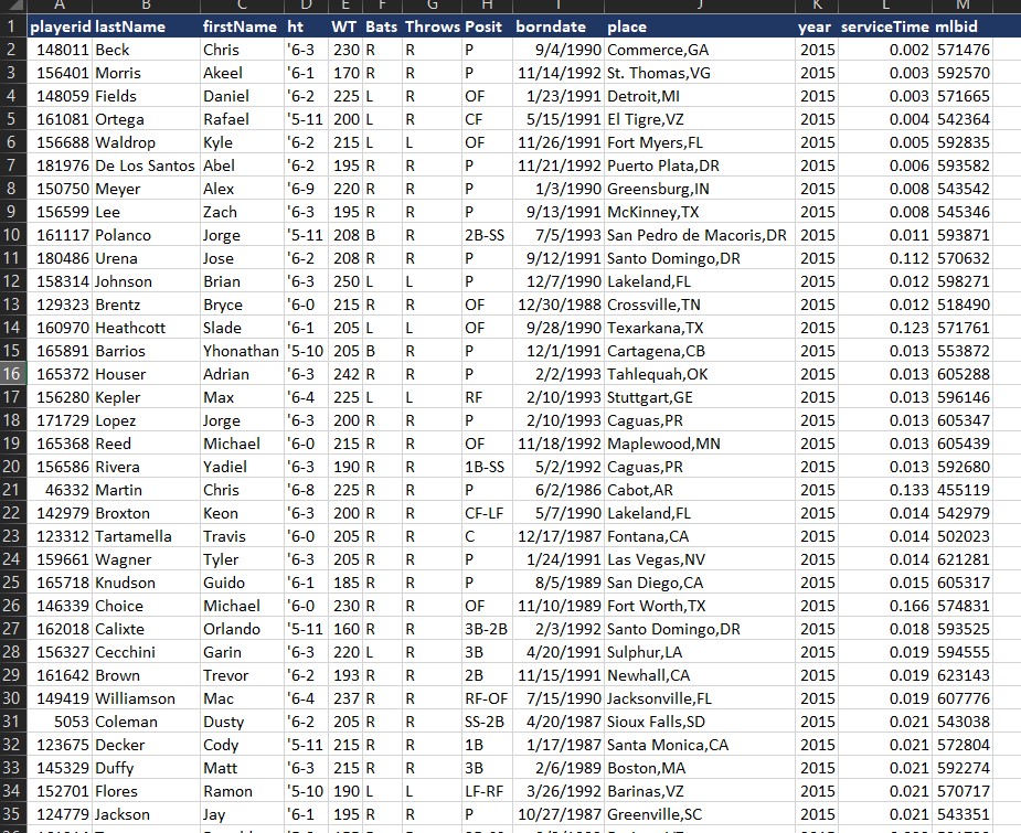 Player service time values for all Major Leaguers since 2015. Service Time is expressed in years.days and is used to designate player eligibility for free agency and arbitration. Values are sourced at the conclusion of the MLB season, once released. There may be some values listed prior to 2015 but is intended to be complete for 2015 onwards.