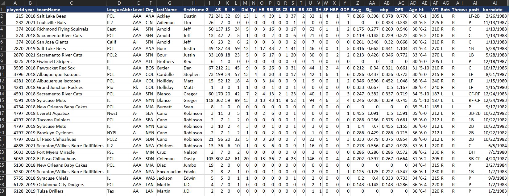 Minor League Stats (last 5 years) CSV file preview #2