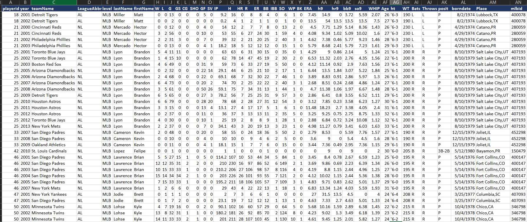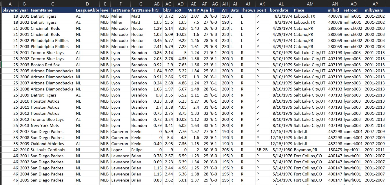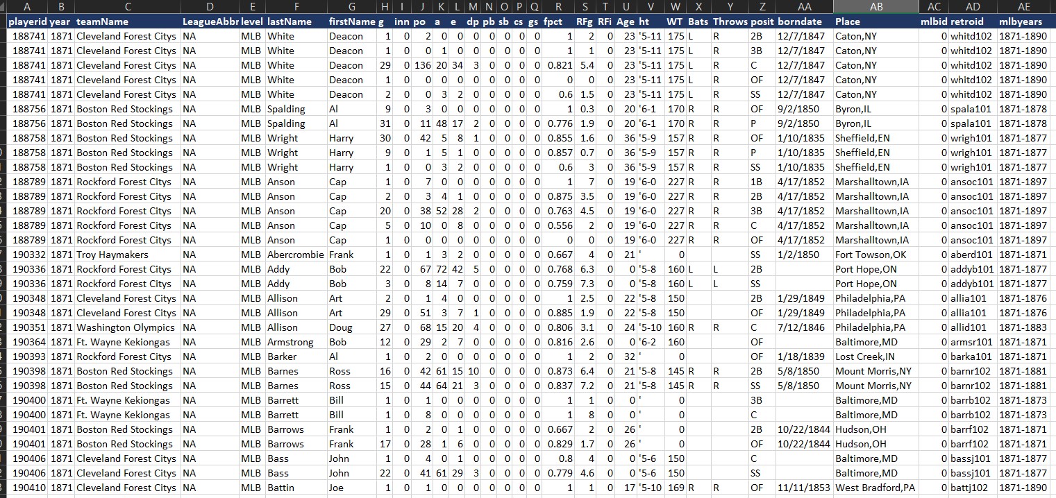 Product Description: Complete Major League Baseball Statistics History for all seasons since 1981. The dataset includes 3 reports. Batting Statistics, Pitching Statistics and Fielding Stats. Stats are available by player, by team, by season. Each record has some player attributes included. The report includes statistics up until the most recently completed Major League Baseball season.
