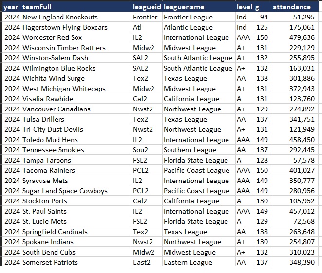 Yearly team-level season attendance totals for Major League Baseball, Minor Leagues and Independent Leagues. Minor League attendance since 1977, Major Leagues since 1903 and Indy League where reported/available since 1993.